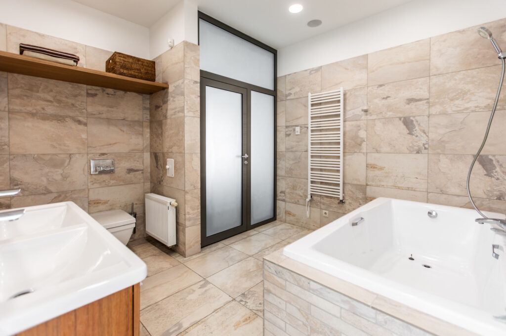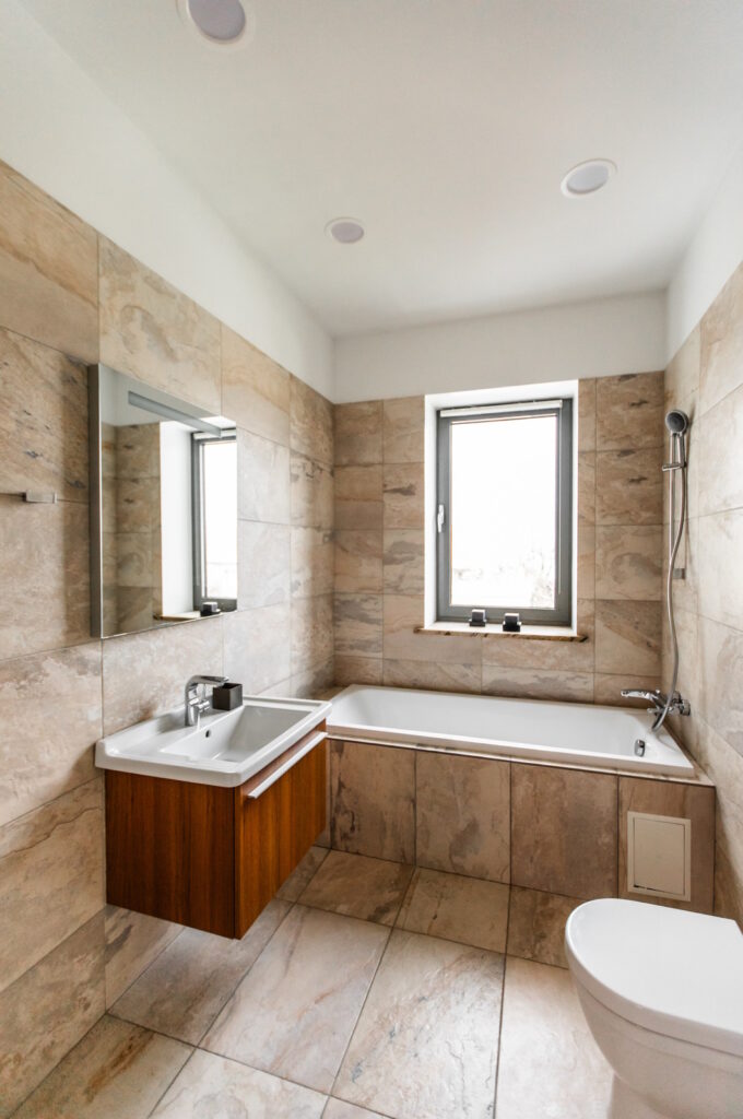 Підвісна сантехніка, подвійний умивальник, велике дзеркало і вікно для доступу денного світла і свіжого повітря.